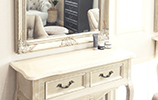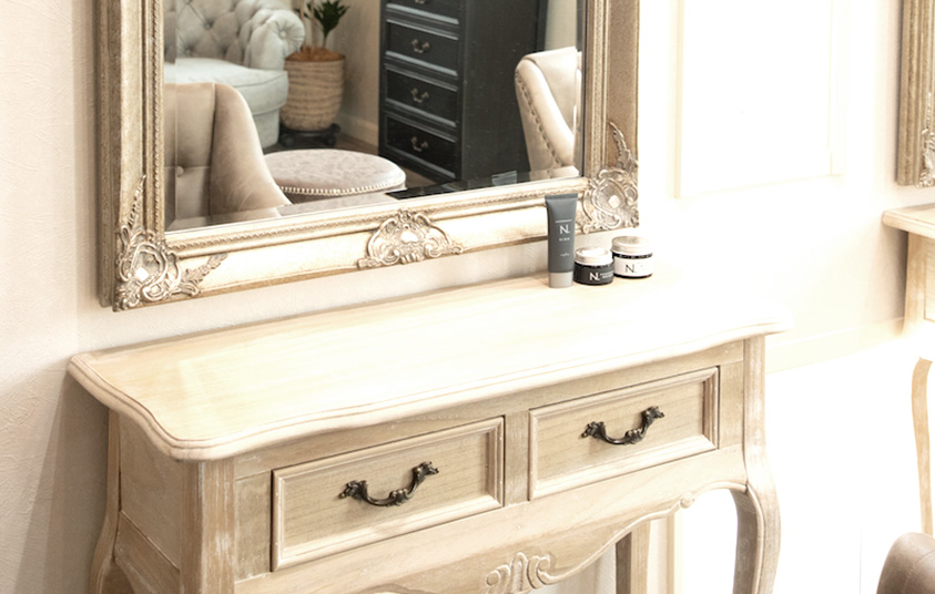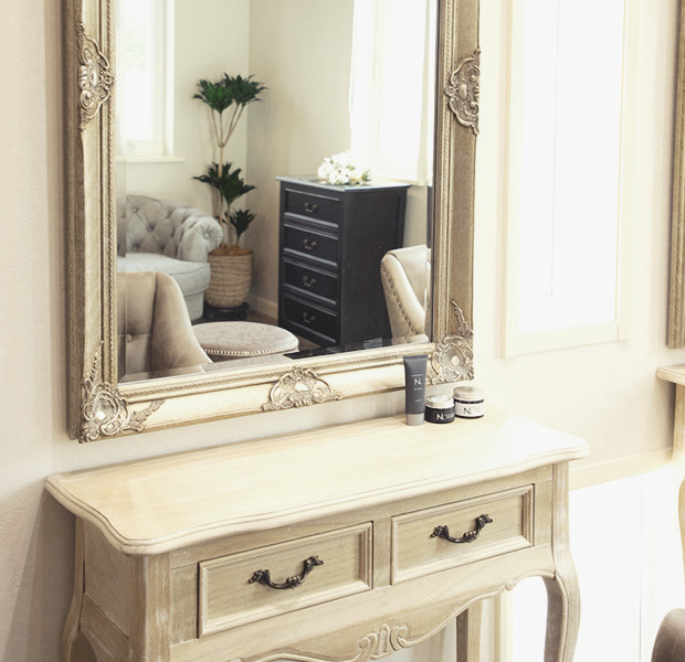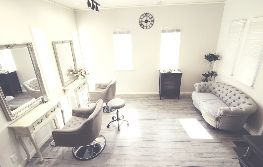 店内は真由美さんこだわりのシャビーシック。白い壁に黒いアイアンや木のブラインドを組み合わせた空間に、アンティーク調のサロンチェアや、ソファ、鏡台など、選りすぐりのアイテムが素敵に調和しています。