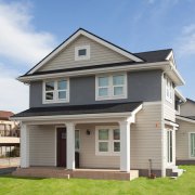 明るい⾊彩の屋根に、⽩いトリムが特徴的なお住まい