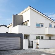 バーチカルウォールが⽬を引く⽩を基調としたモダンデザインの邸宅