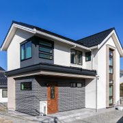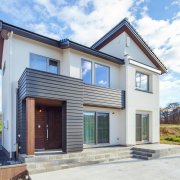 ブラック横⽬地サイディングと、天然⽊を⽤いたエントランス 陰影を出した厚みのある家