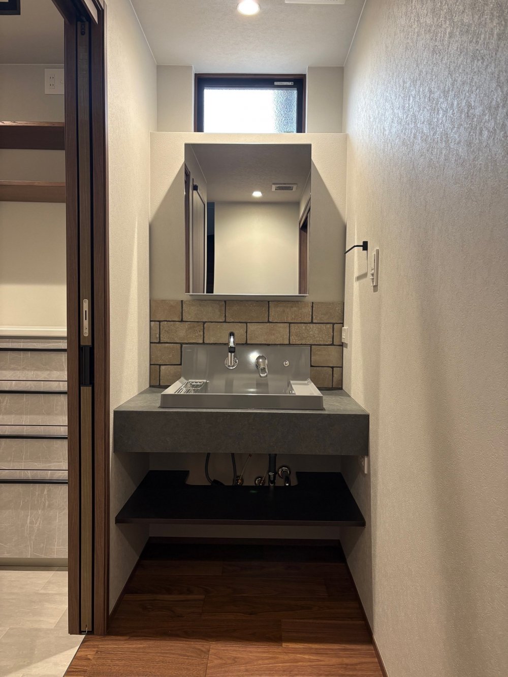 カウンターのチャコールグレー、タイルのベージュ、ダークウッドのフローリングと、全体的にアースカラーで統一されており、シックでスタイリッシュな洗面化粧台。ミラーの上に窓が配置されており、プライバシーを守りつつ自然光を効率よく取り込みます。