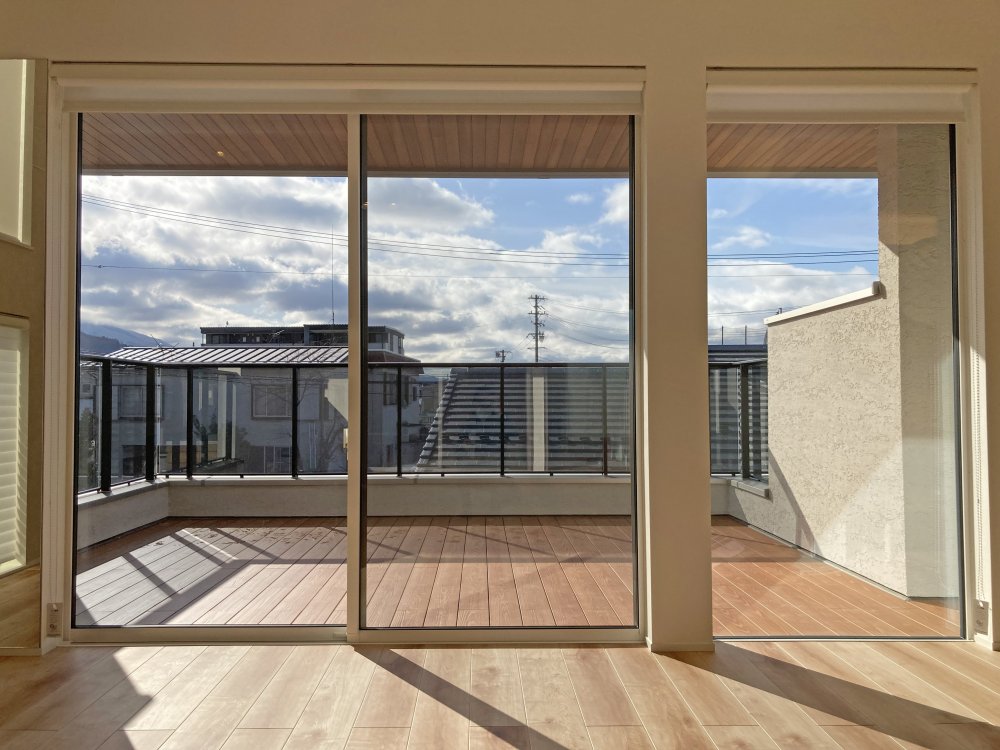 リビングからフラットにつながる広々としたウッドデッキ空間。深い軒が日差しを遮り、天候に左右されにくい「もうひとつのリビング」として活用できます。