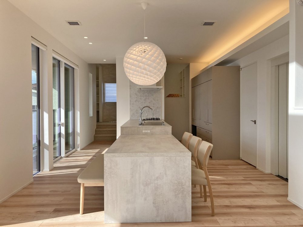 主役のキッチンはキッチンハウスのグランキッチン。光に照らされた月面をイメージさせるホワイトカラーは、ほんのりとしたニュアンスのあるグレーが混ざり合った、上品で表情豊かな色合いが特徴で、現代的で洗練された雰囲気を演出しています。