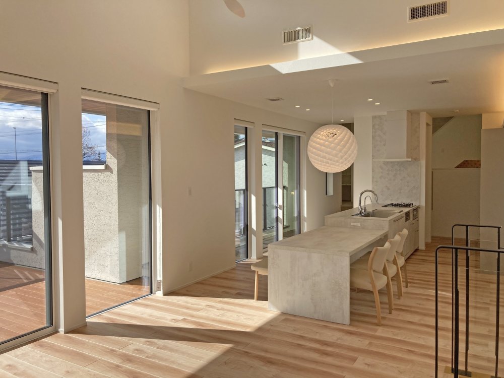 ダイニングテーブルと一体化した大型のアイランドキッチンが、LDKの主役。料理をしながらリビング全体を見渡せる、コミュニケーションの中心となる設計です。