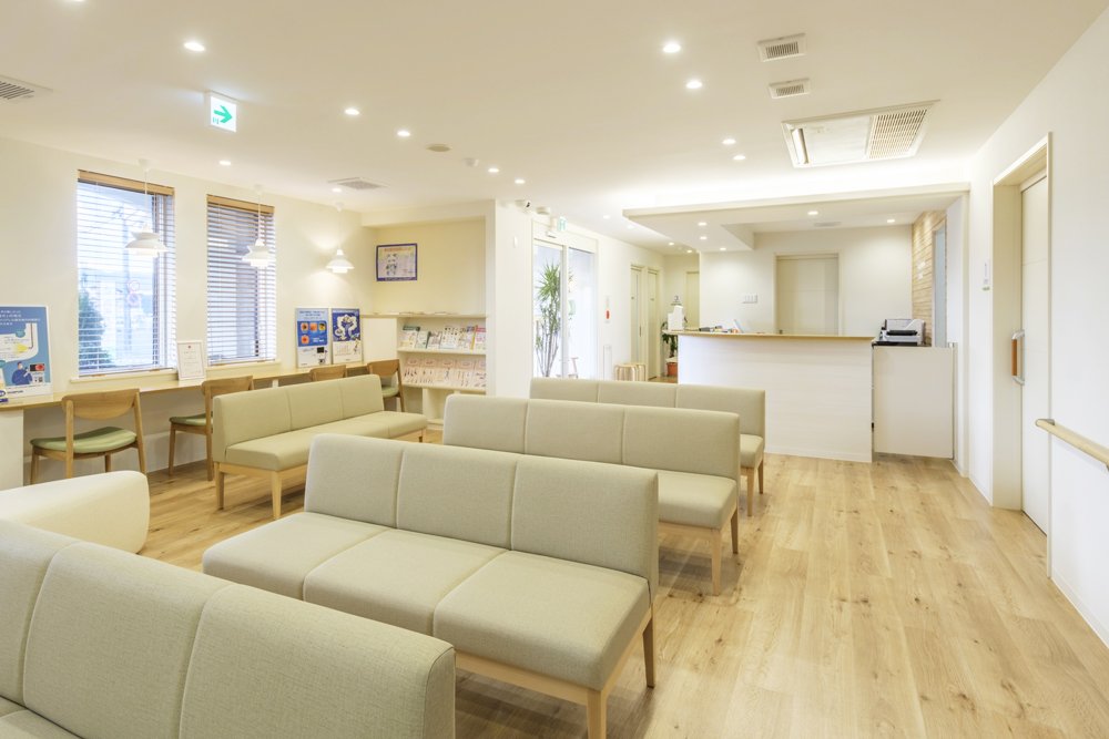 待合室|並んで座れるベンチ席のほか、窓際にはカウンター席もあります。ルイスポールセンの照明を配し、居心地の良いカフェのよう。