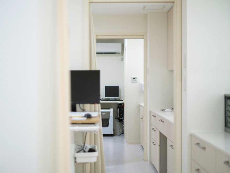 バックヤード|診察室や処置室をつなぐバックヤードは、スタッフが往来しやすいよう広めの通路を設け、スムーズな動線を確保しています