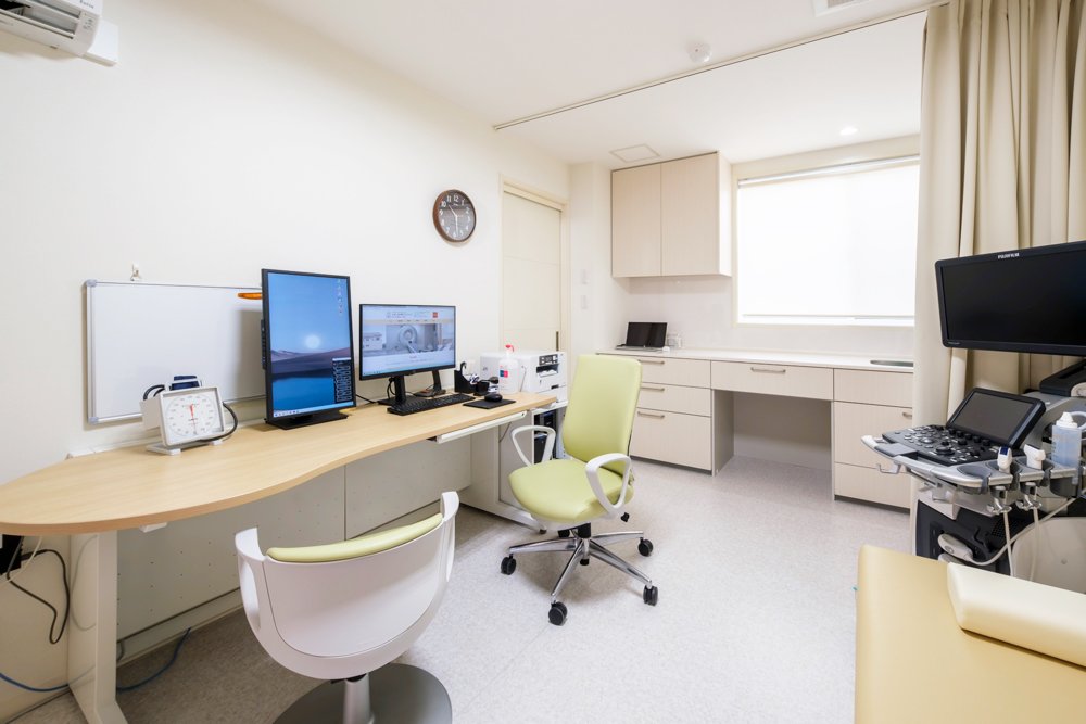 診察室|診察中のプライバシーにも配慮して、オルゴールのBGMが流れるスピーカーを診察室前の天井に設置。診察室内の会話が待合スペースに漏れにくい工夫をしています。