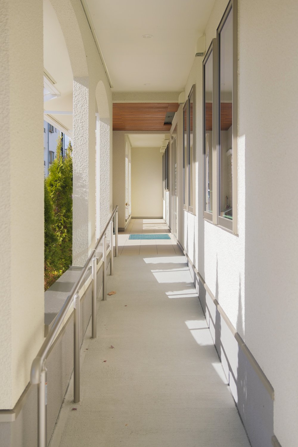 スロープ|アーチが続く屋根付きのポーチの下は緩やかなスロープが続き、車いすの患者さんも院内までスムーズに入ることができます。
