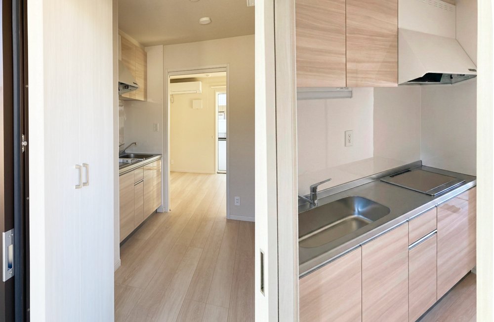 室内は、白を基調とした壁と、温かみのある木目調のフローリングを組み合わせた、明るく清潔感のある空間です。