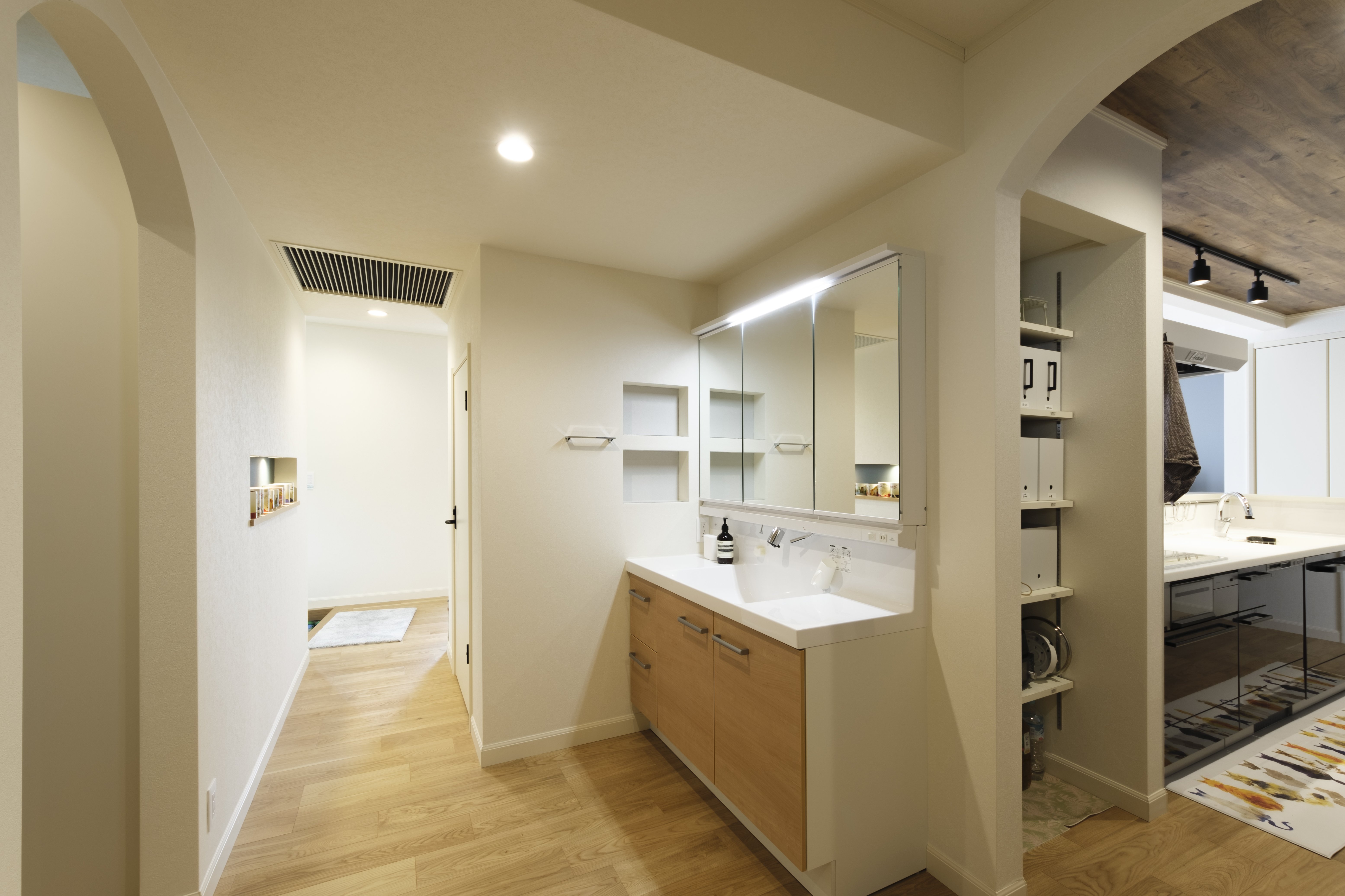 ゆるやかなアーチが美しい、各部屋へ続く廊下。共働きだからこそ、時間を有効活用するための効率的な家事動線が考えられた間取りは必見です。