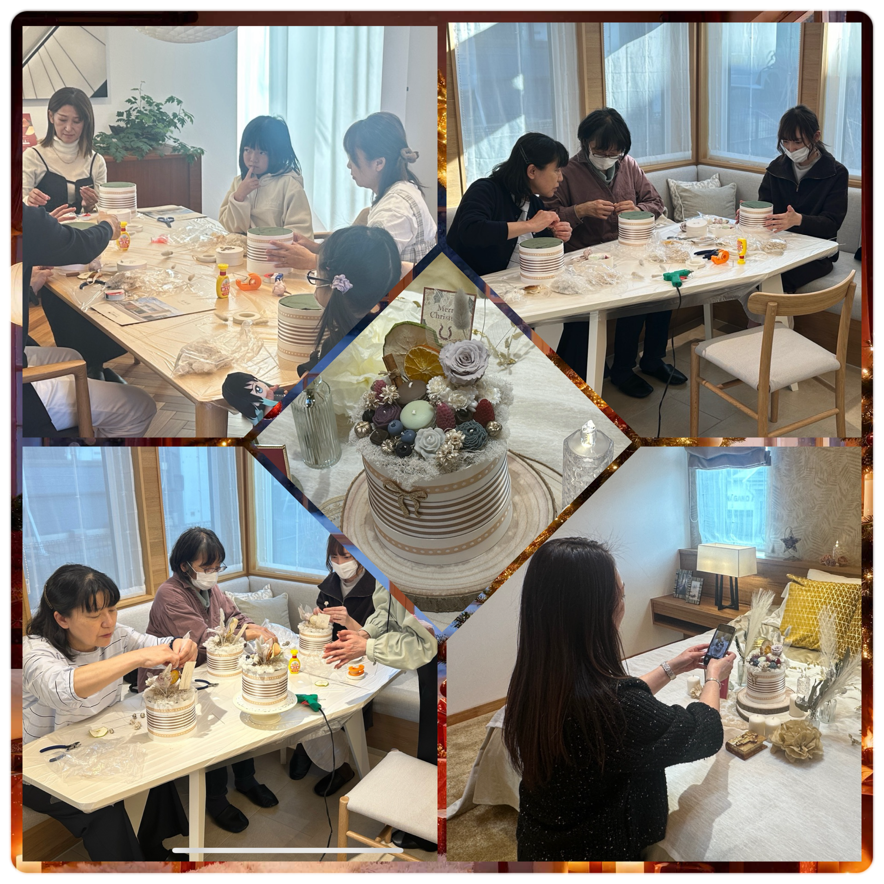 白いホールケーキを模したアレンジメントは、クリスマスにぴったり。インテリアにはもちろん、キャンドルの香りと、柔らかな灯りをお楽しみいただけます。ご家族・ご友人とのご参加も歓迎です。